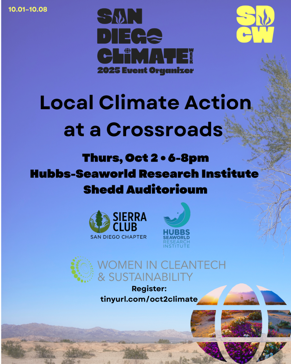 By registering for this event, you agree to share your registration information with the organizers of San Diego Climate Week and our event platform partner, Climatebase. Your information will not be shared with third parties.